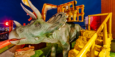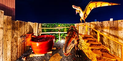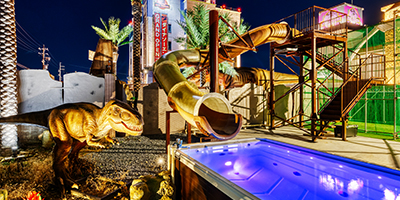 スポーツアトラクションと恐竜を見ながらの露天風呂が楽しめます。